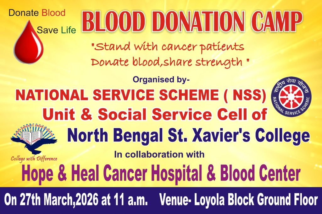 We are pleased to invite you to participate in the Blood Donation Camp organized by the NSS Unit & Social Service Cell of North Bengal St. Xavier’s College in collaboration with Hope & Heal Cancer Hospital & Blood Center.