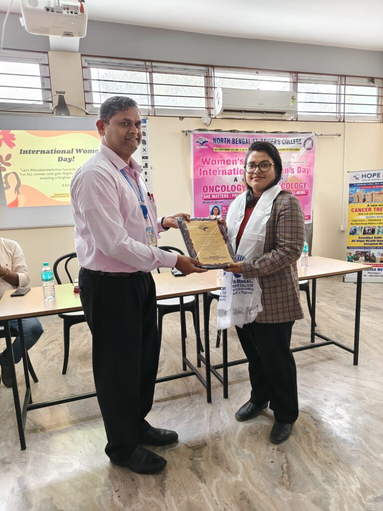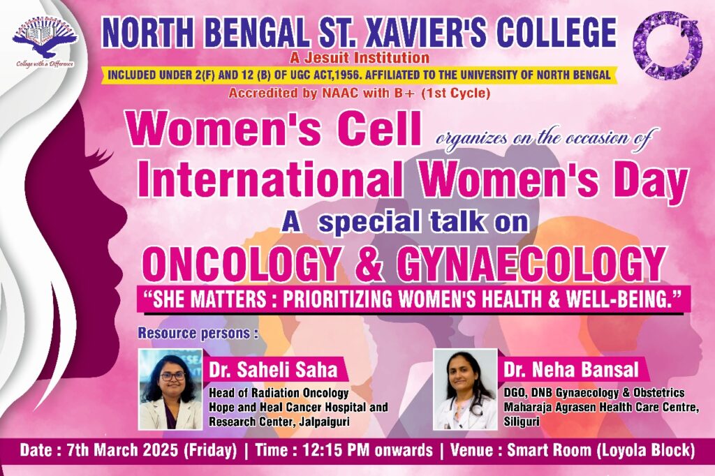 On the occasion of International Women’s Day, the Women’s Cell of North Bengal St. Xavier’s College organized a special session on 7th March 2025 with the theme “She Matters: Prioritizing Women’s Health and Well-being.” The event, attended by female staff members, Women’s Cell members, and 6th-semester female students from all streams, featured esteemed resource persons—Dr. Saheli Saha (Oncologist) and Dr. Neha Bansal (Gynecologist). Dr. Saha emphasized cancer prevention, early detection, and the importance of regular check-ups, while Dr. Bansal addressed reproductive health, menstrual hygiene, and overall well-being. The interactive session provided participants with expert advice, making it an insightful and empowering experience. The event successfully highlighted the importance of prioritizing women’s health and fostering a culture of awareness and self-care.